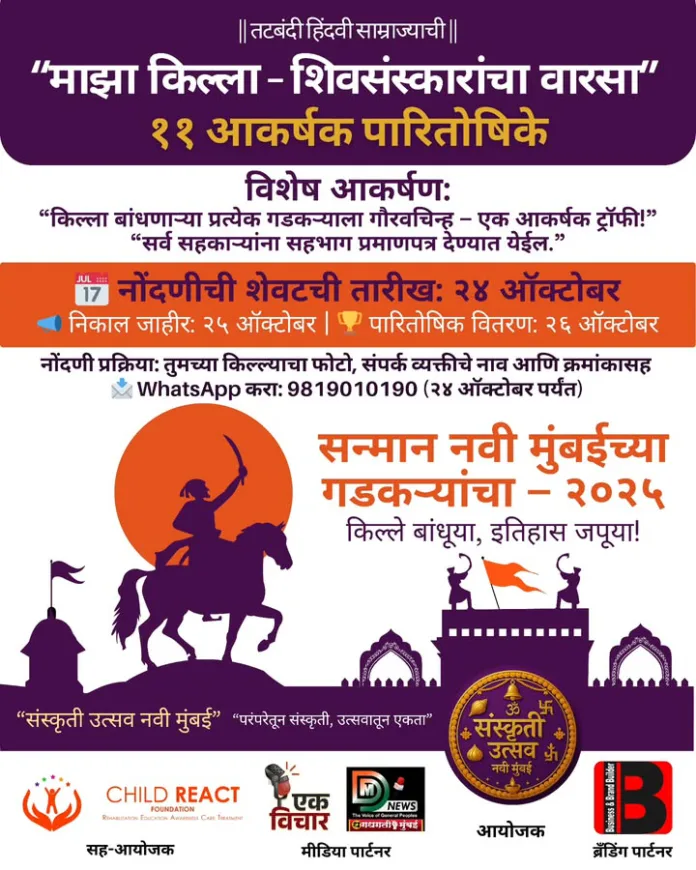 नवी मुंबई : हिंदवी साम्राज्याच्या गौरवशाली परंपरेचा वारसा जपण्यासाठी ‘संस्कृती उत्सव नवी मुंबई’तर्फे “माझा किल्ला – शिवसंस्कारांचा वारसा” हा उपक्रम राबविण्यात येत आहे. या उपक्रमात नव्या पिढीला शिवचरित्र आणि गडकोट संस्कृतीची ओळख करून देण्याचा सुंदर प्रयत्न केला जात असून, यासाठी ११ आकर्षक पारितोषिकांची घोषणा करण्यात आली आहे.