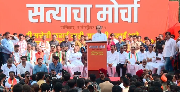 मुंबई : विरोधी पक्षांनी मुंबईत आज झालेल्या सत्याचा मोर्चामध्ये उत्तराखालील आरोप आणि इशार्यांनी तापलेल्या राजकारणाला नवी गती दिली. शिवसेना (UBT) अध्यक्ष उद्धव ठाकरे यांनी मतदारयादीतील गोंधळ आणि कथित मतचोरीवर कटाक्षांनी निशाणा साधला आणि केंद्रातील नेत्यांवर तीव्र टीका केली.