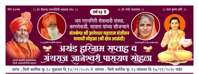 कापसेवाडी : गगनगिरी सेवाभावी संस्था, कापसेवाडी यांच्या सौजन्याने आणि प. पू. महायोगी गगनगिरी महाराजांचे कृपापात्र शिष्य प. पू. ब्रह्मलिन महामंडलेश्वर वैराटवासी स्वामी आबानंदगिरीजी महाराज तसेच वात्सल्यमूर्ती वै. सौ. जयश्री (माई) यांच्या कृपा-आशीर्वादाने संतश्रेष्ठ श्री ज्ञानेश्वर महाराज संजीवन समाधी सोहळा (श्री क्षेत्र आळंदी) निमित्ताने अखंड हरिनाम सप्ताह व ग्रंथराज ज्ञानेश्वरी पारायण सोहळ्याचे आयोजन करण्यात आले आहे.